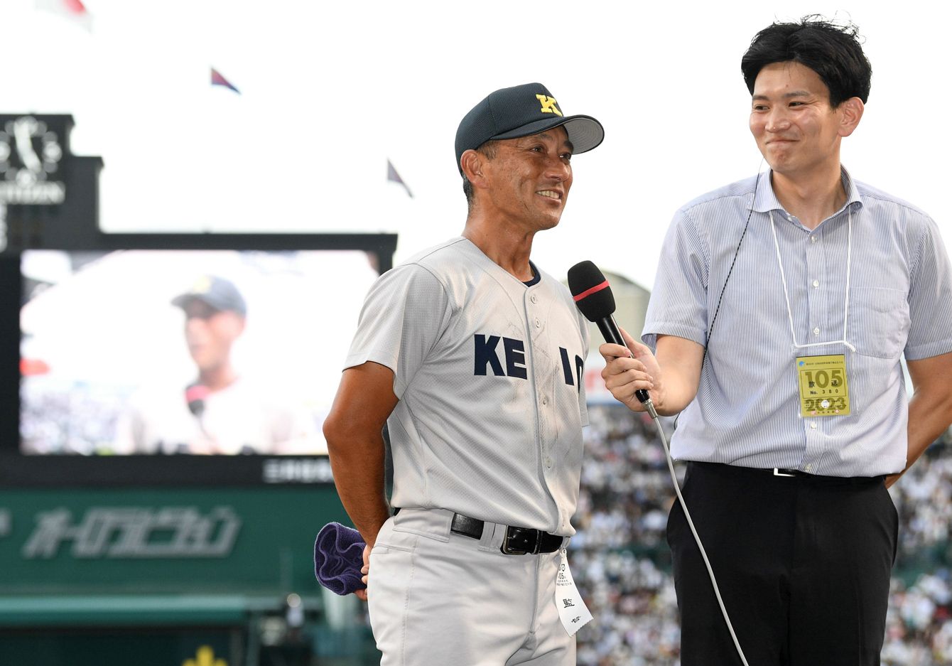107年ぶり2度目の優勝を果たし、インタビューに答える慶應の森林貴彦監督(左)=2023年8月23日、甲子園[代表撮影]