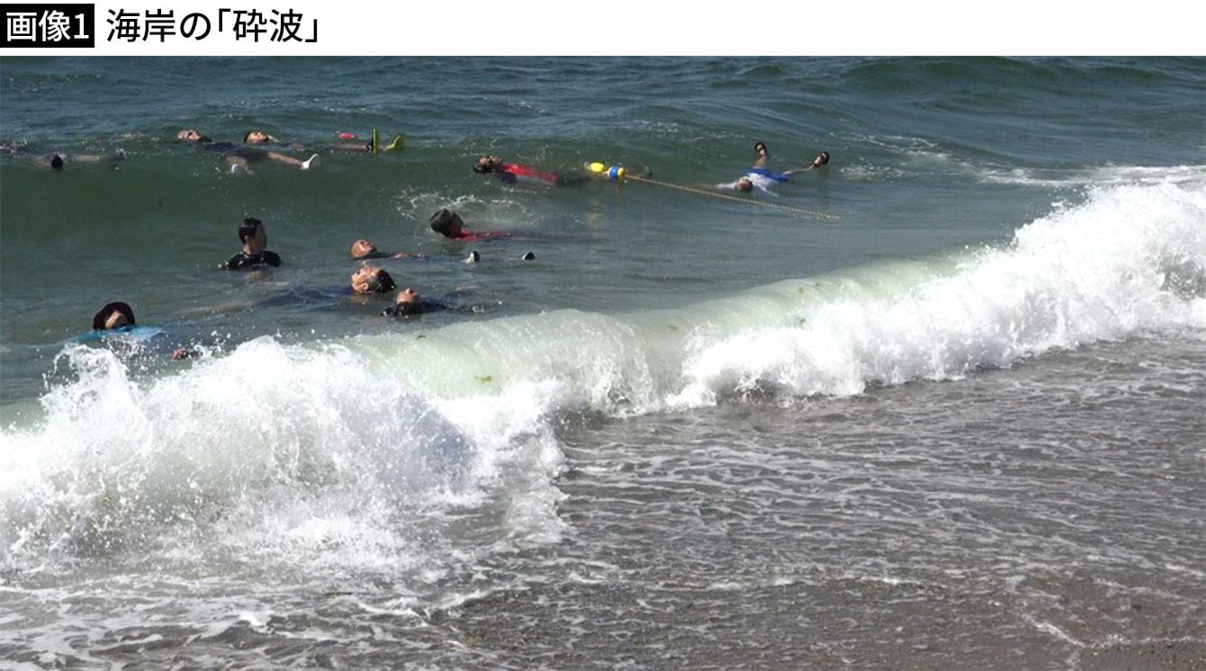 白い波が砕波、沖の次の波までの間が砕波帯。写真左側に立っている男性を見ると、深さが成人の肩ぐらいということがわかる。水難学会指導員養成講習会で、5分間の背浮き実技訓練中。2012年9月、愛知県田原市