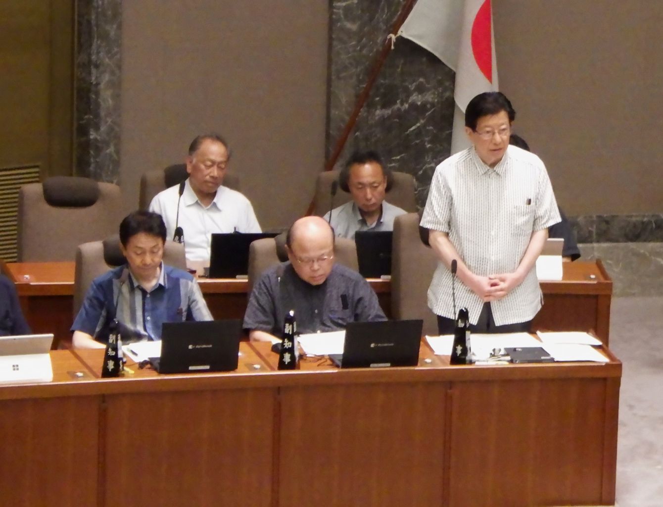 静岡県議会本会議場で川勝知事の隣に座る(左から)森、出野の両副知事