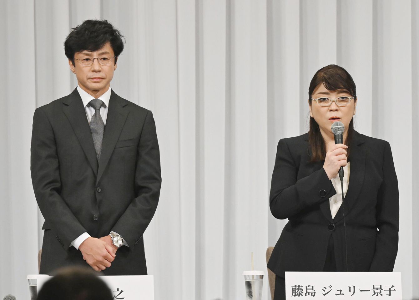 性加害問題で記者会見するジャニーズ事務所の藤島ジュリー景子氏(右)。左は新社長に就任した東山紀之氏=2023年9月7日午後、東京都千代田区