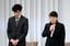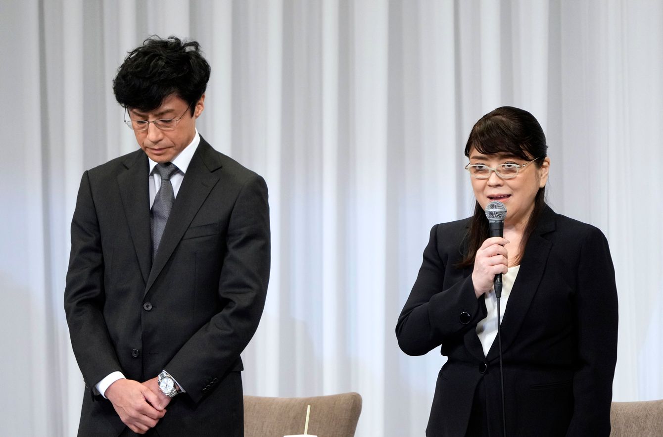 記者会見する藤島ジュリー景子前社長(右)と東山紀之新社長(左)=2023年9月7日、東京都港区(藤島ジュリー景子氏は、日本を代表するタレント事務所であるジャニーズ事務所の代表取締役社長を辞任したことを発表した)