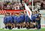 テストマッチ・日本-トンガ。試合前に国歌斉唱するラグビー日本代表の選手=2023年7月29日、大阪・花園ラグビー場