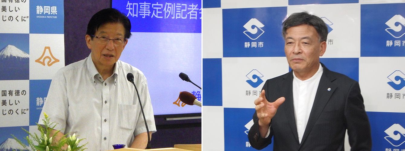 【左】9月5日の定例会見で環境影響評価法を逸脱した発言を繰り返した川勝知事【右】9月6日開催の静岡市リニア環境影響評価協議会で県の主張に反論した難波市長