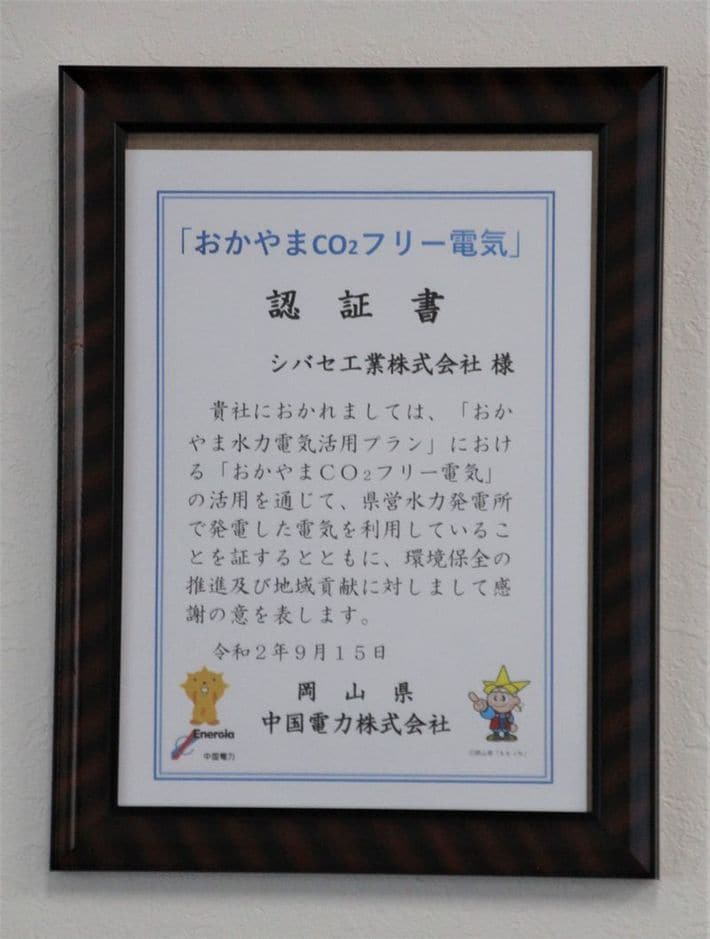 「おかやまCO2フリー電気」の認証書(撮影=プレジデントオンライン編集部)