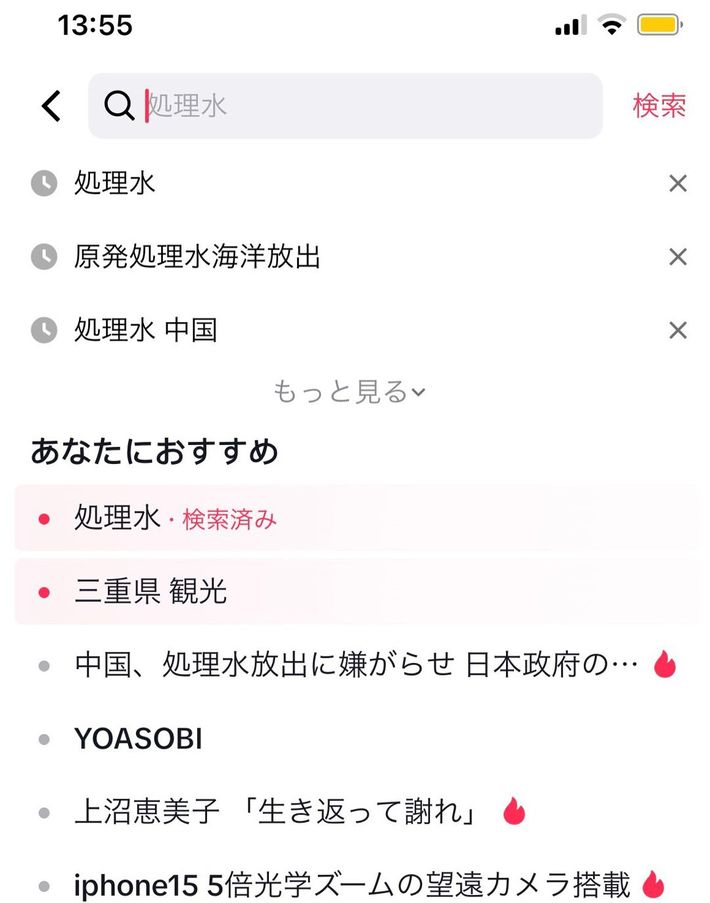 TikTokで「処理水」と検索した結果