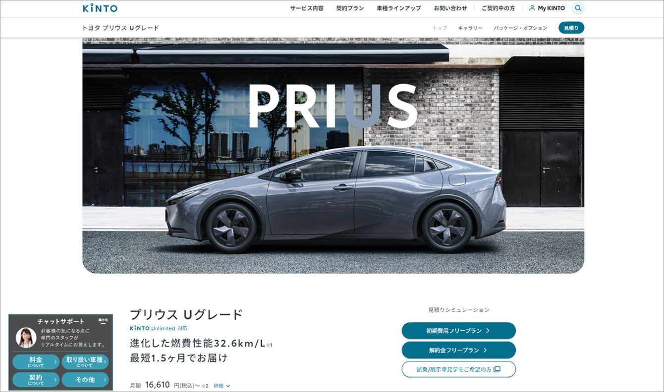 トヨタが展開する車のサブスクリプションサービス、KINTOのホームページ。