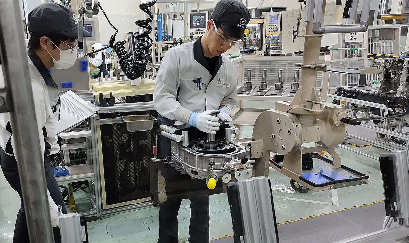 マツダの工場で新型ロータリーエンジンを組み上げるエンジニア