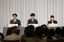 記者会見するジャニーズ事務所の(右から)藤島ジュリー景子氏、東山紀之氏、井ノ原快彦氏=2023年9月7日、東京都千代田区