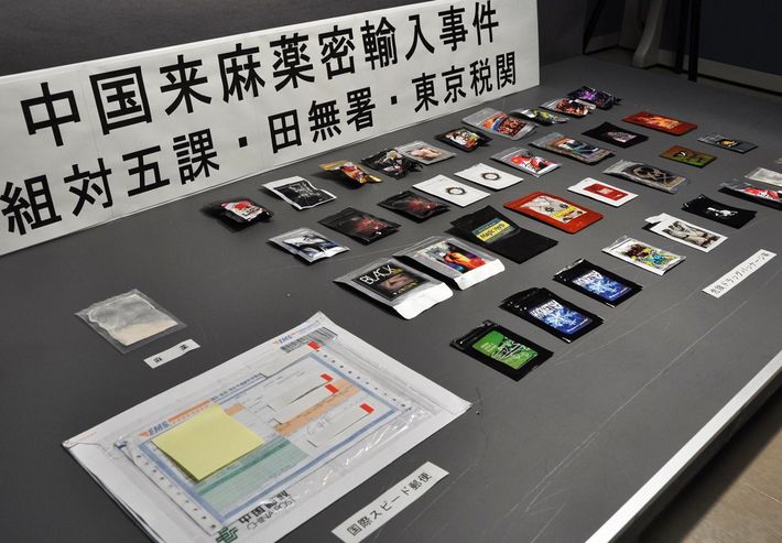中国から密輸された麻薬や容疑者宅から見つかった危険ドラッグの袋など=2015年4月21日午前、警視庁