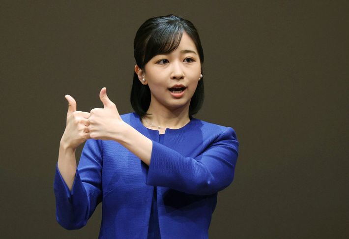 全国高校生の手話によるスピーチコンテストで、手話を交えてあいさつされる秋篠宮家の次女佳子さま=2023年8月27日午後、東京都千代田区[代表撮影]
