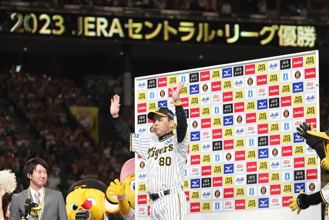 18年ぶりのリーグ優勝を決め、インタビューに答える阪神の岡田彰布監督(=2023年9月14日、甲子園)