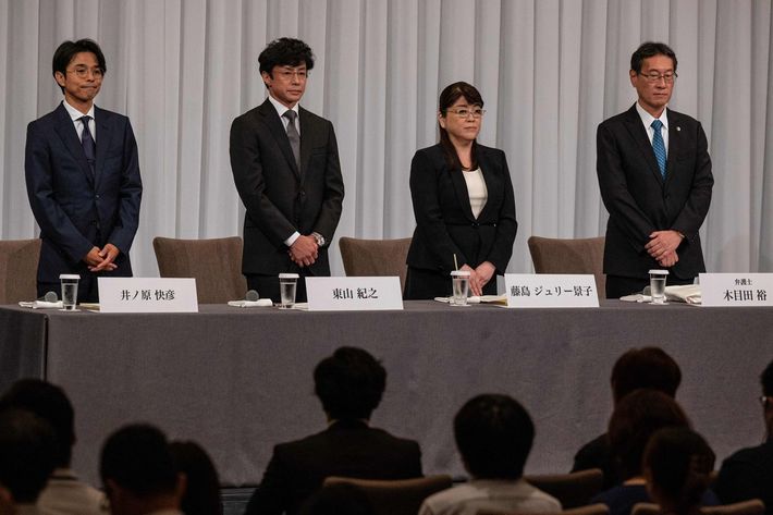 記者会見に臨むジャニーズ事務所の藤島ジュリー景子前社長(右から2人目)ら=2023年9月7日