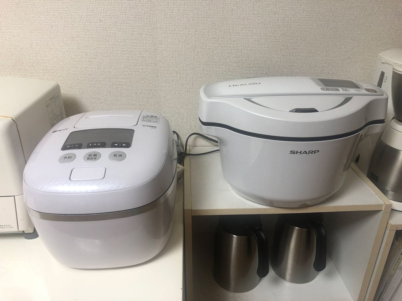 炊飯器(左)と自動調理器(右)。自動調理器の購入は正解だった。子どものお迎えに行っている間に夕食が出来上がる。