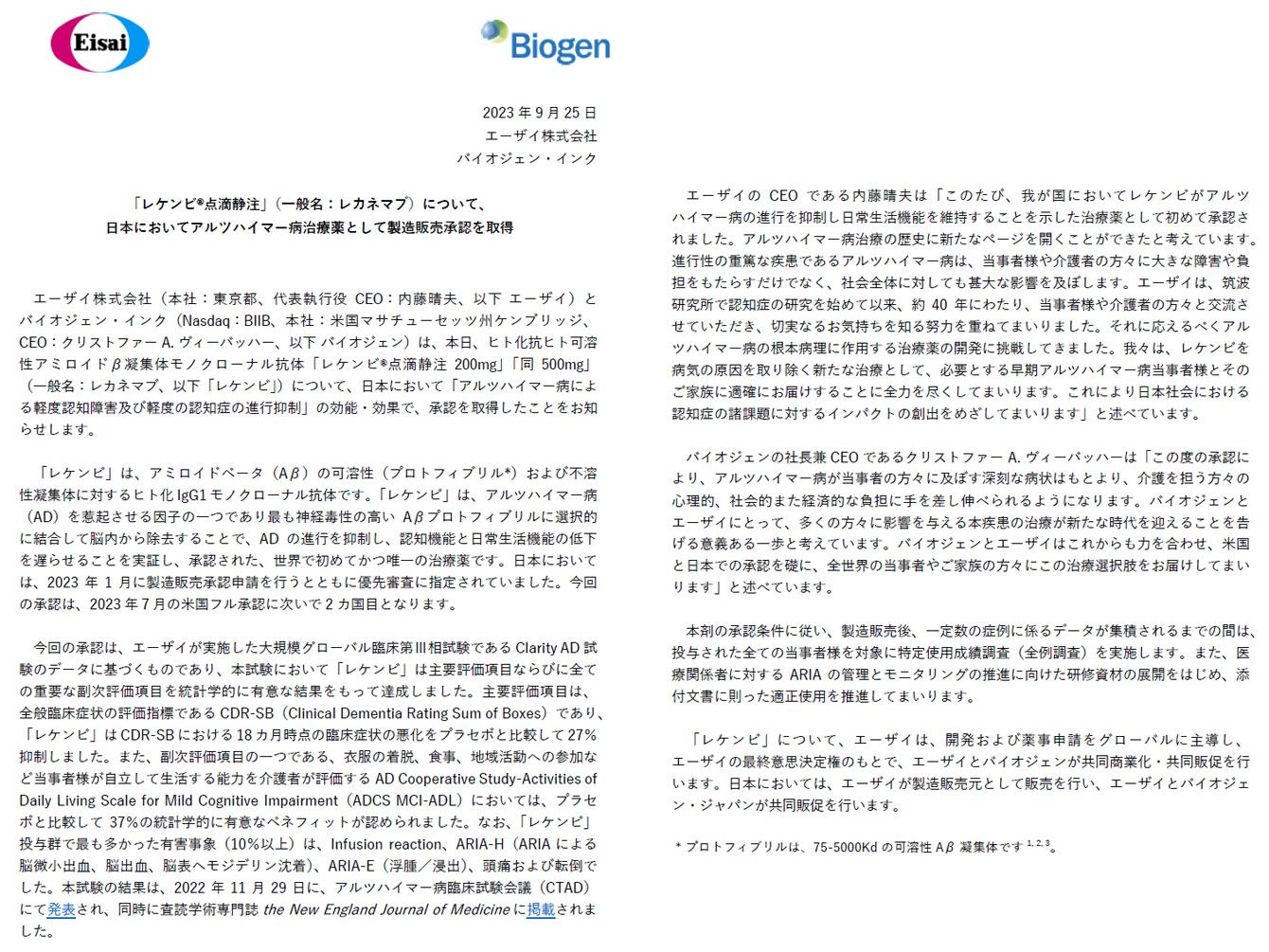『レケンビ®点滴静注』(一般名:レカネマブ)について、 日本においてアルツハイマー病治療薬として製造販売承認を取得