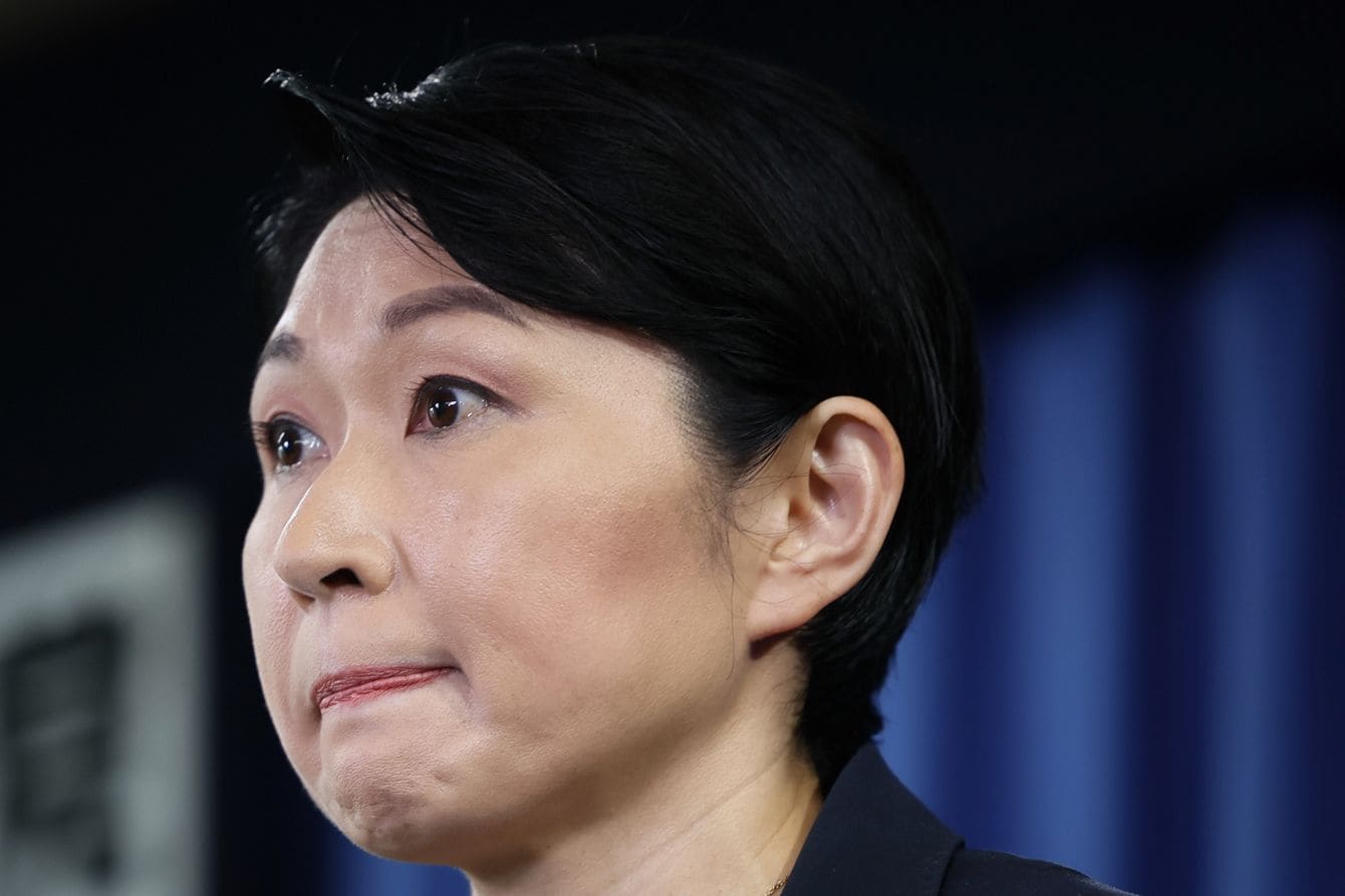 記者会見で政治資金問題に関する質問を受け、厳しい表情を見せる自民党の小渕優子選対委員長=2023年9月13日午前、東京・永田町の同党本部
