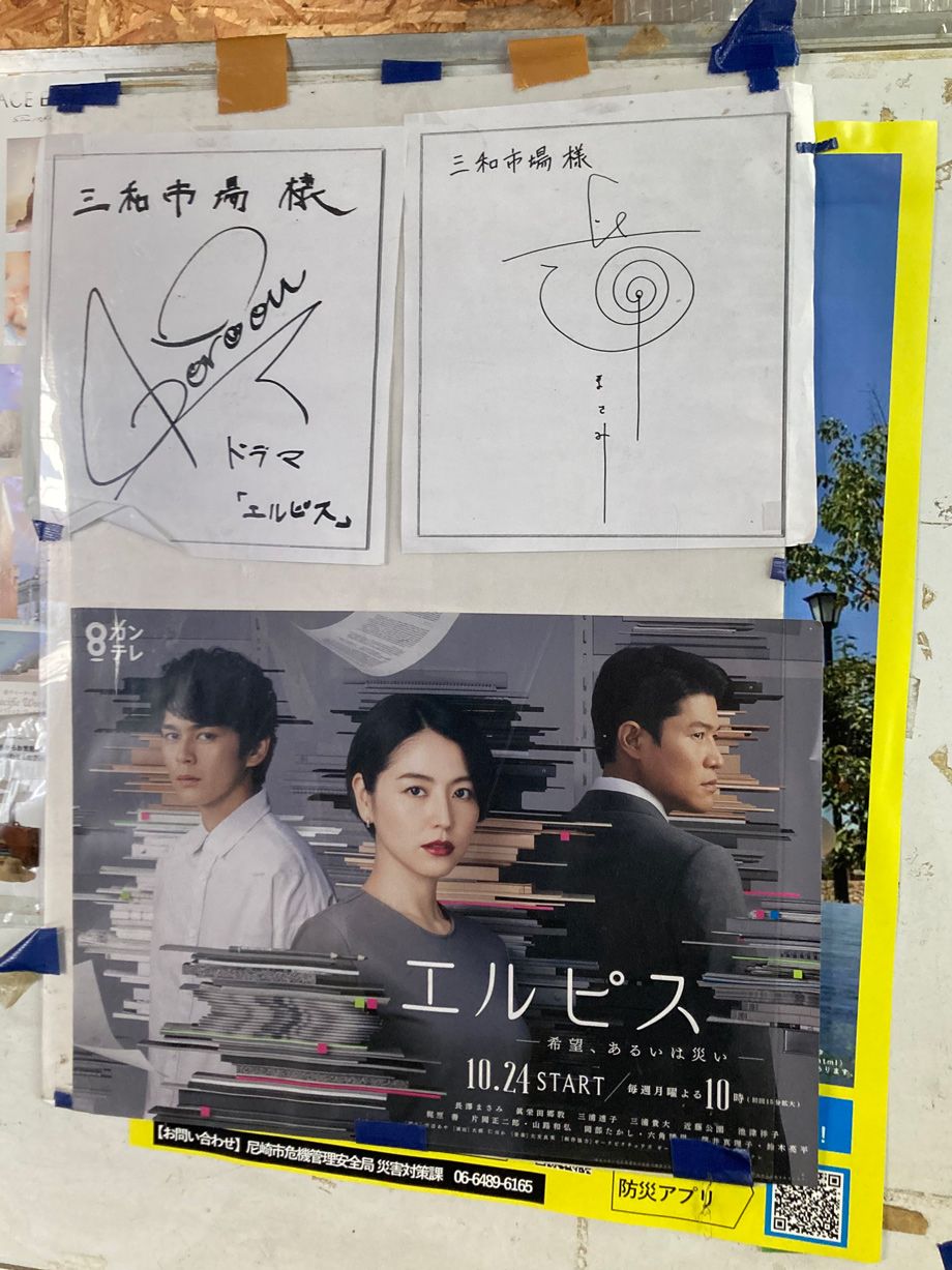 ドラマ『エルピス―希望、あるいは災い―』(カンテレ)のポスターと出演者のサイン。三和市場は、怪しげなシャッター商店街の舞台になった。