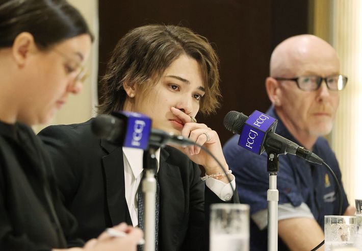 ジャニーズ事務所の記者会見を受け、心境を語るカウアン・オカモトさん(中央、2023年9月8日、東京都千代田区)