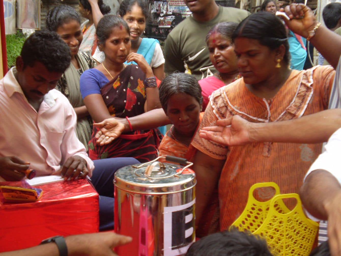 ラッサムを試食し、アンケートに答えるチェンナイの人々