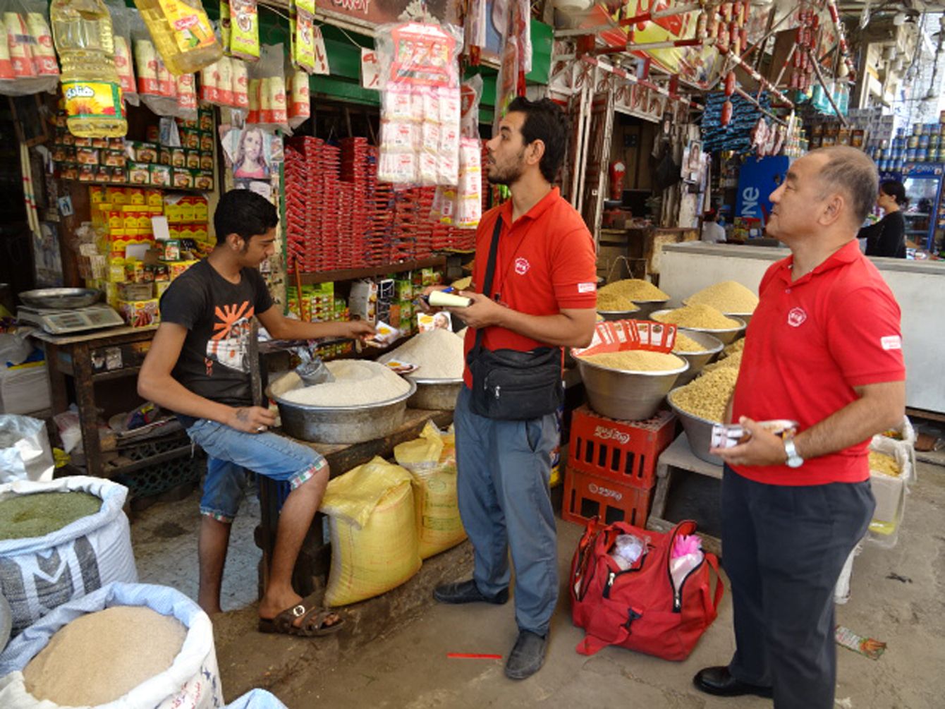 カイロの市場でセールスマンと一緒に営業をする宇治弘晃氏(右)