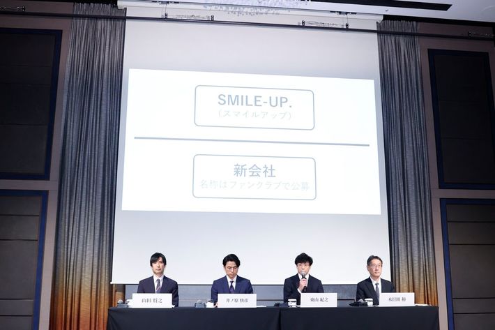 2023年10月2日、会見で新社名「SMILE-UP.」を発表する東山紀之社長(右)と井ノ原快彦副社長