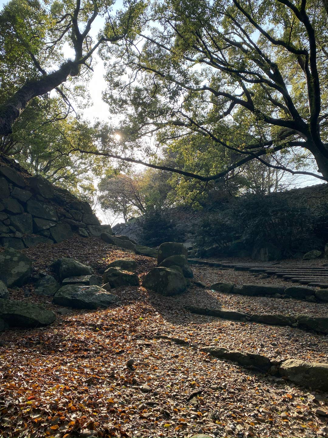 名護屋城の本丸大手口の現状。江戸初期に石垣の要所が崩されながらも、いまの往時のスケールがよく伝わる。