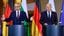 2023年10月4日、ドイツ・ベルリンの首相官邸で共同記者会見に臨むドイツのオラフ・ショルツ首相と訪問中のブルガリアのニコライ・デンコフ首相(左)。