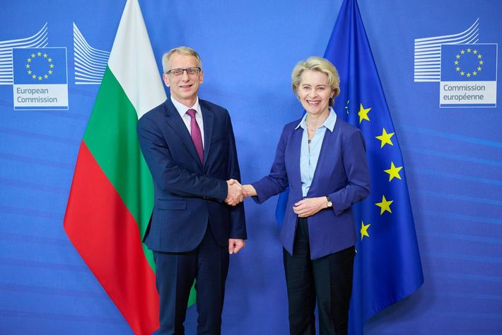 ブルガリアのニコライ・デンコフ首相(左側)と握手するウルズラ・フォン・デア・ライエン欧州委員会委員長(=2023年6月28日)