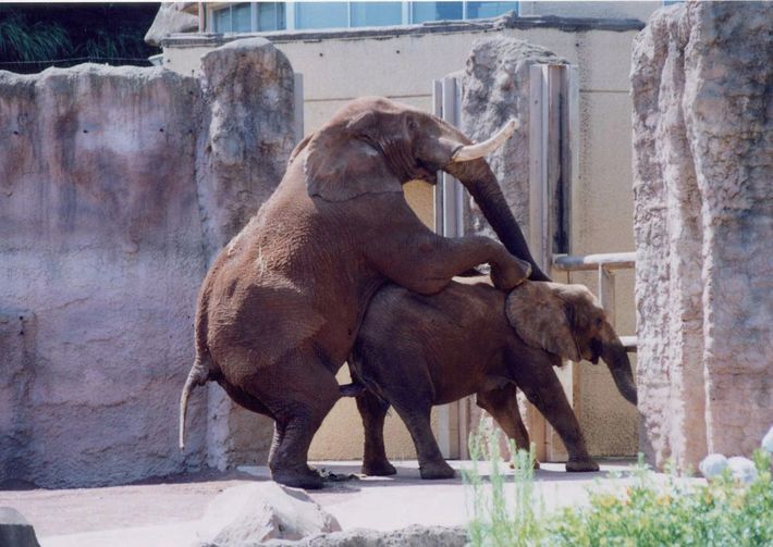 アフリカゾウ(オスのタマオとメスのアイ)の交尾(2000年8月1日、多摩動物公園にて)
