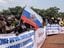 2023年3月22日、中央アフリカ共和国でのロシアと中国の駐留を支持するデモ行進中、バンギでロシアの国旗を掲げるデモ参加者