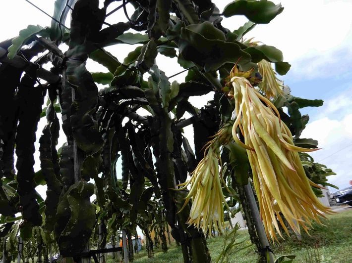 生命力の旺盛さを感じさせるドラゴンフルーツの木。昼間に訪れたため、花はしぼんでいた