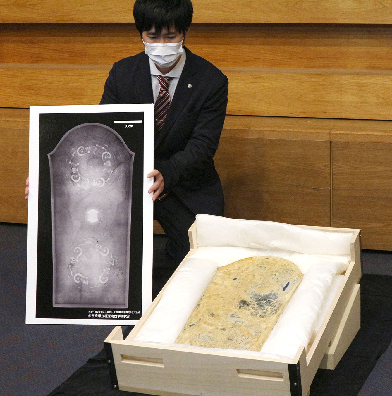 富雄丸山古墳で出土した盾形の銅鏡(2023年1月20日、奈良県橿原市)