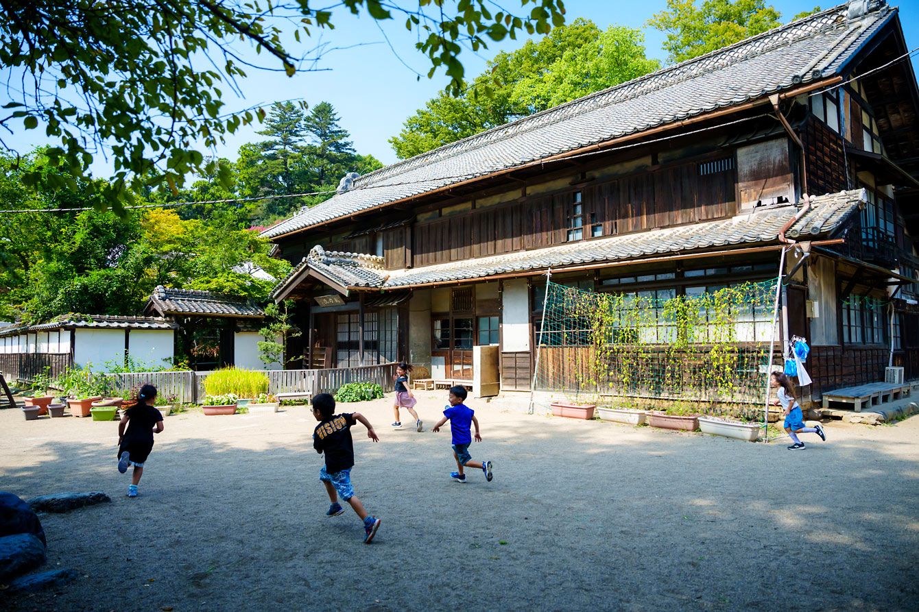 園庭を走る小俣幼児生活団の子どもたち。近くに自転車に乗れる広いグラウンドもある。