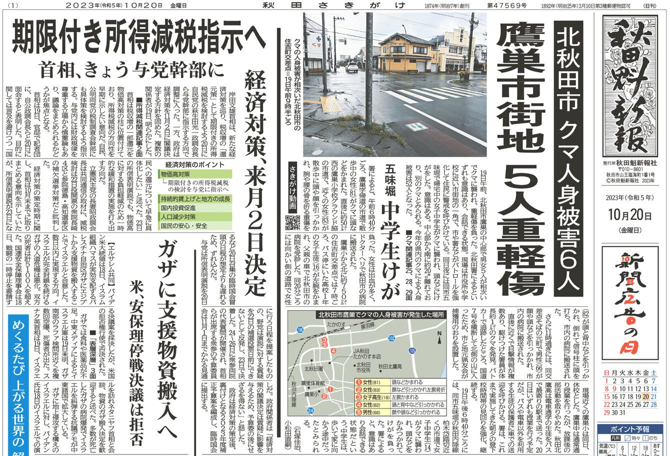 木の上に登ったクマ=2023年10月13日午前11時34分、秋田県仙北市角館