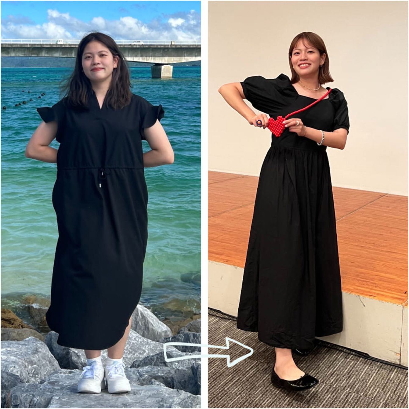 左がダイエット前で右が現在。YouTubeではファッションコーデを紹介することも。6kg痩せて洋服の幅も広がったそう