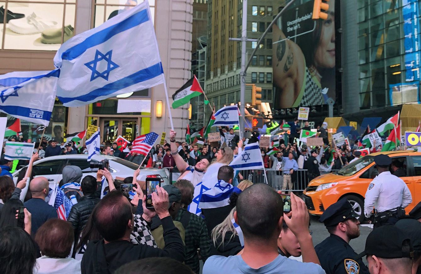 2023年10月13日、ニューヨークでイスラエルの国旗を掲げる人たち(左手前)。道路を挟んで向こう側は抗議活動を行うパレスチナ支持の人々