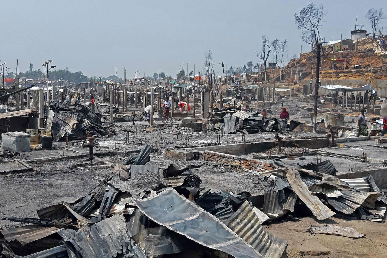 2021年3月23日、バングラデシュ南東部コックスバザールで、焼け落ちたミャンマーのイスラム系少数民族ロヒンギャ難民キャンプ(バングラデシュ)