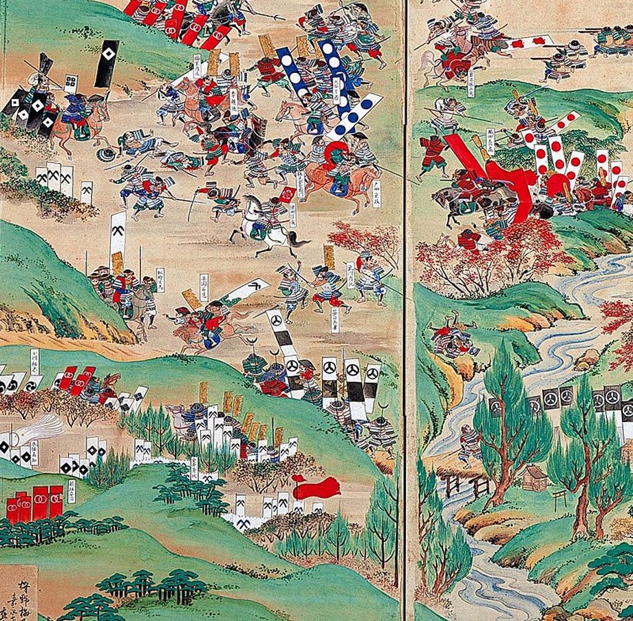 狩野貞信作、彦根城本「関ヶ原合戦屏風」(部分)。左下に松尾山に陣を敷いた小早川軍(違い鎌の旗印)が描かれている(画像=関ヶ原町歴史民俗資料館所蔵/CC-PD-Mark/