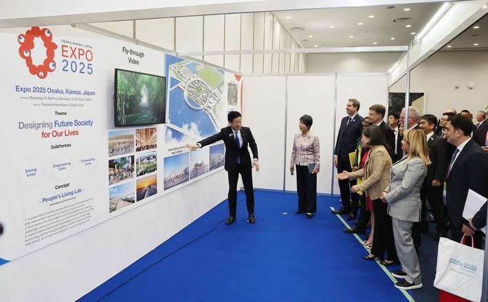 先進7カ国(G7)貿易相会合の各国代表らに2025年大阪・関西万博について説明する西村康稔経済産業相(左端)と上川陽子外相(左から2人目)=2023年10月28日、大阪市北区
