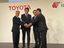 全固体電池の開発に関する共同記者会見で撮影に応じるトヨタ自動車の佐藤恒治社長、出光興産の木藤俊一社長ら
