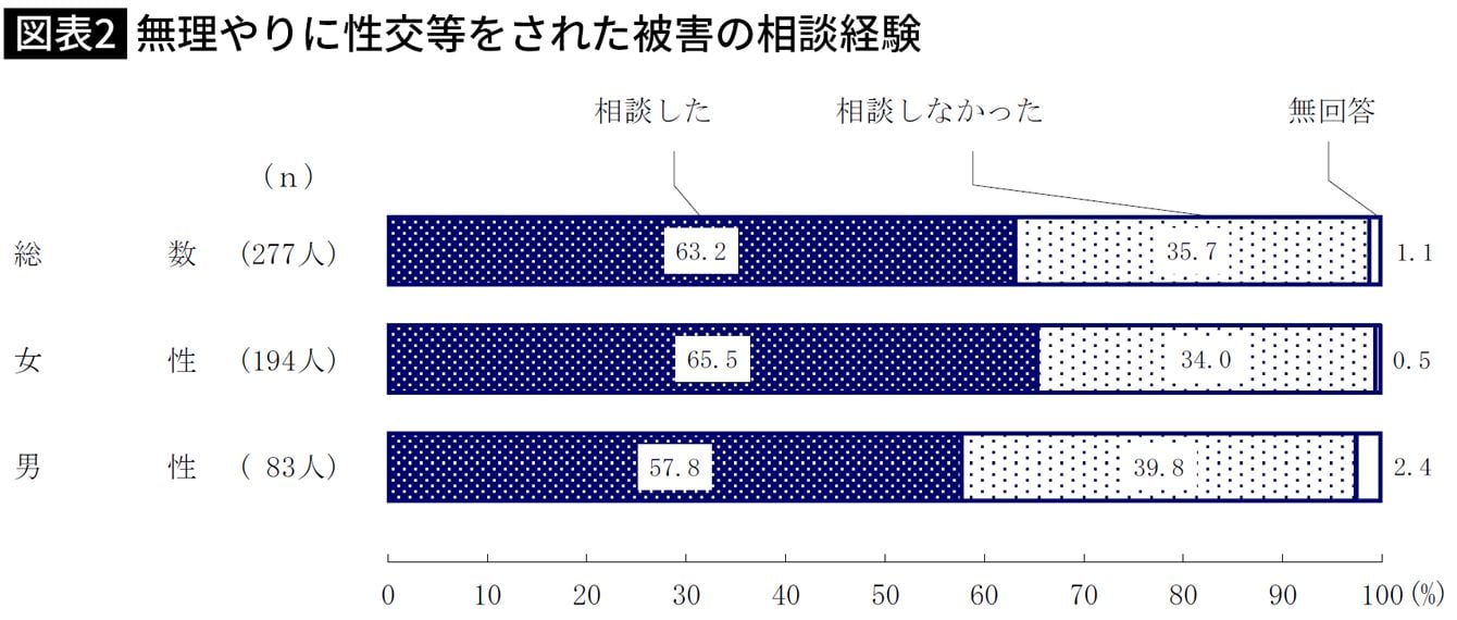 約24人に1人、そのうち女性の約14人に1人は無理やりに性交等をされた経験がある(内閣府男女共同参画局「男女間における暴力に関する調査」令和3年3月)