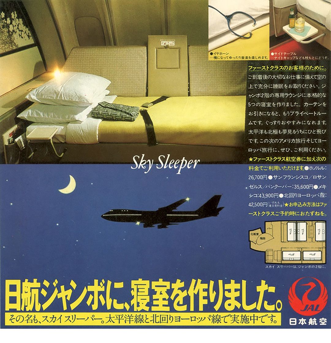 豪華なファーストクラスのサービスを紹介したJALのパンフレット(1963年発行日本のつばさの中刷り)。