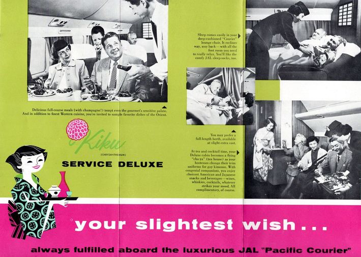 豪華なファーストクラスのサービスを紹介したJALのパンフレット(1963年発行日本のつばさの中刷り)。