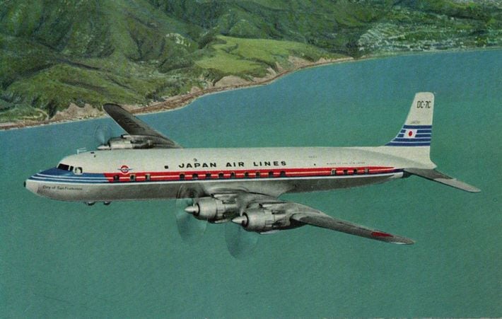 米国製JAL公式絵葉書より。豪華なファーストクラスのサービス。後部にファーストクラスがあったDC-7Cのものと思われる。