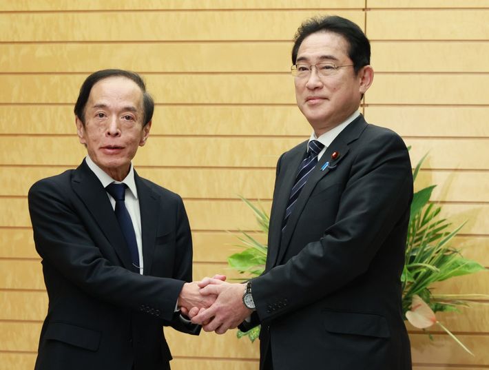 辞令交付後、握手する日銀の植田和男総裁(左)と岸田文雄首相=2023年4月10日、首相官邸