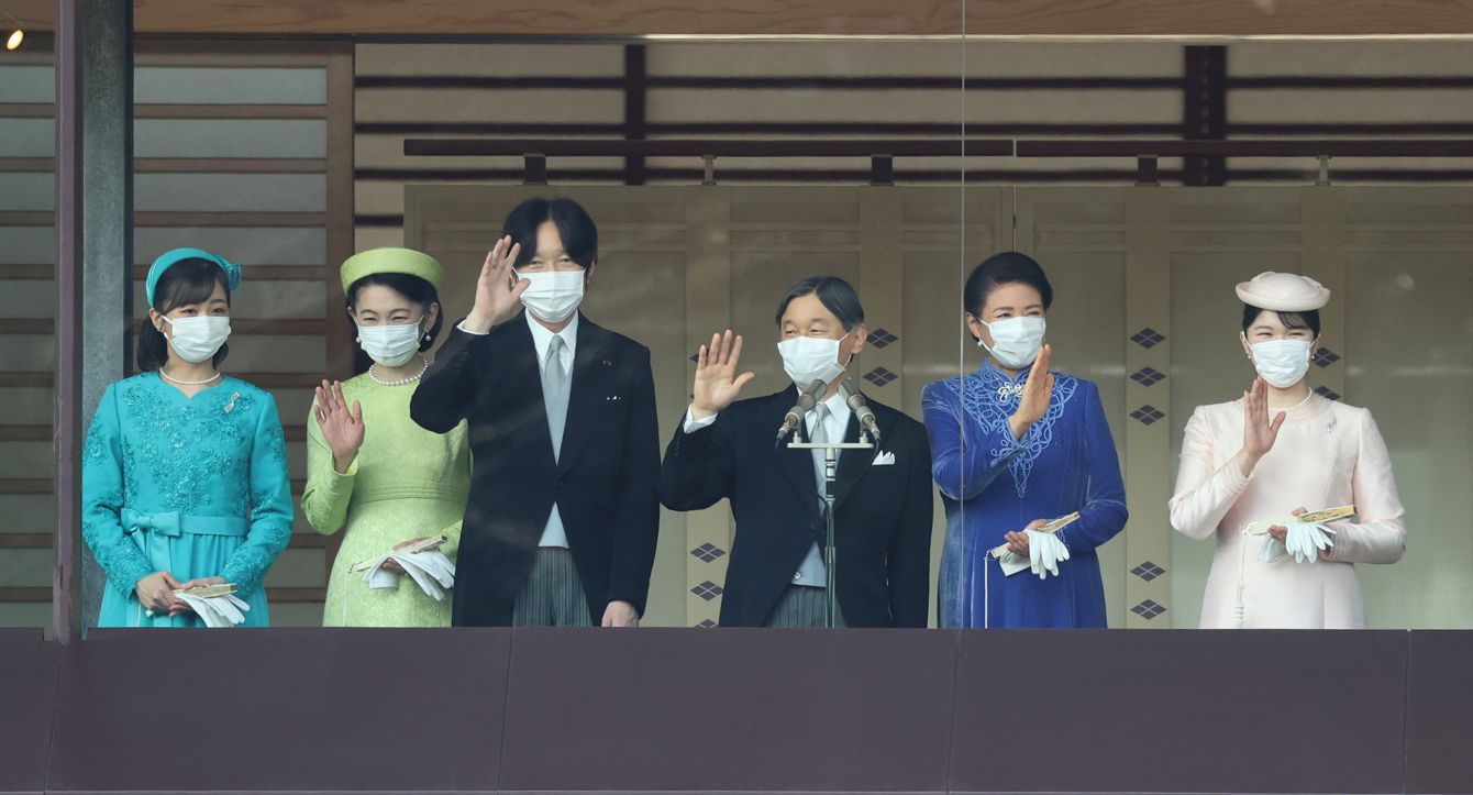 天皇誕生日の一般参賀で手を振られる天皇、皇后両陛下と長女愛子さま、秋篠宮ご夫妻と次女佳子さま。2023年2月23日午前、皇居