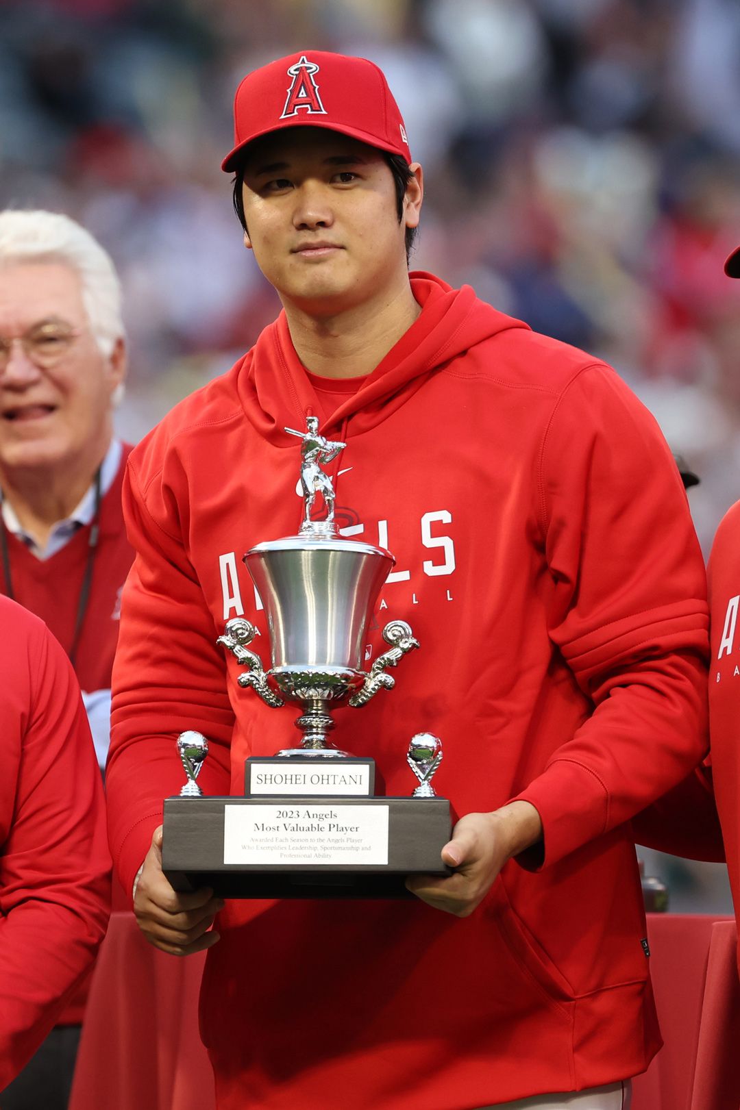 2023年9月30日、3年連続でチームMVPに選ばれたロサンゼルス・エンゼルスの二刀流・大谷翔平選手(中央)=カリフォルニア州アナハイム、エンゼル・スタジアム