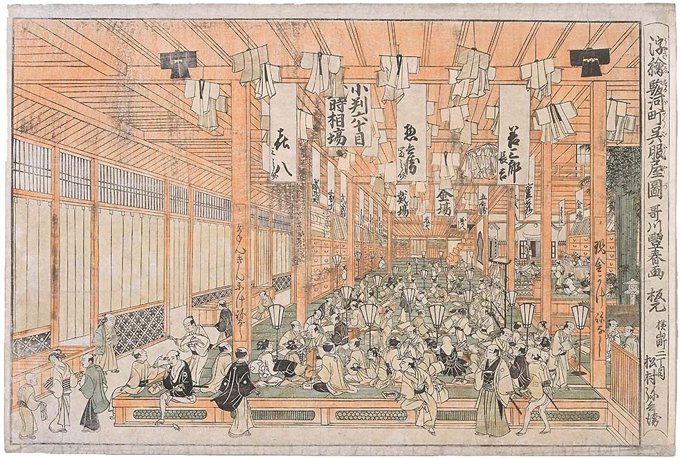駿河町の三井越後屋の店内を描いた「浮絵駿河町呉服屋図」(写真=PD-Japan/