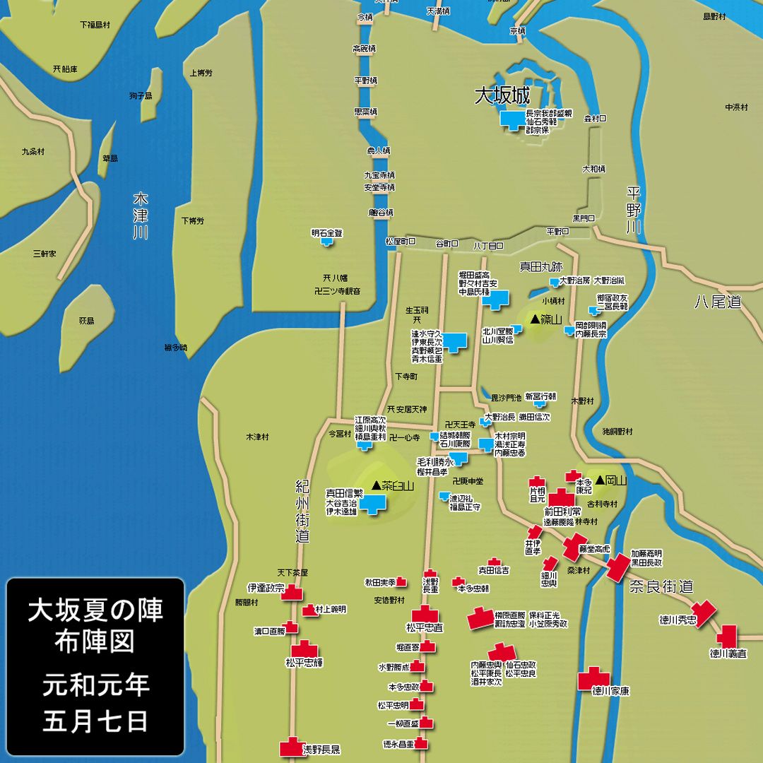 左下の紀州街道沿いに伊達政宗の陣[画像=大坂夏の陣(天王寺・岡山合戦)布陣図/投稿者Jmhoが作成/CC-BY-SA-3.0-migrated-with-disclaimers/