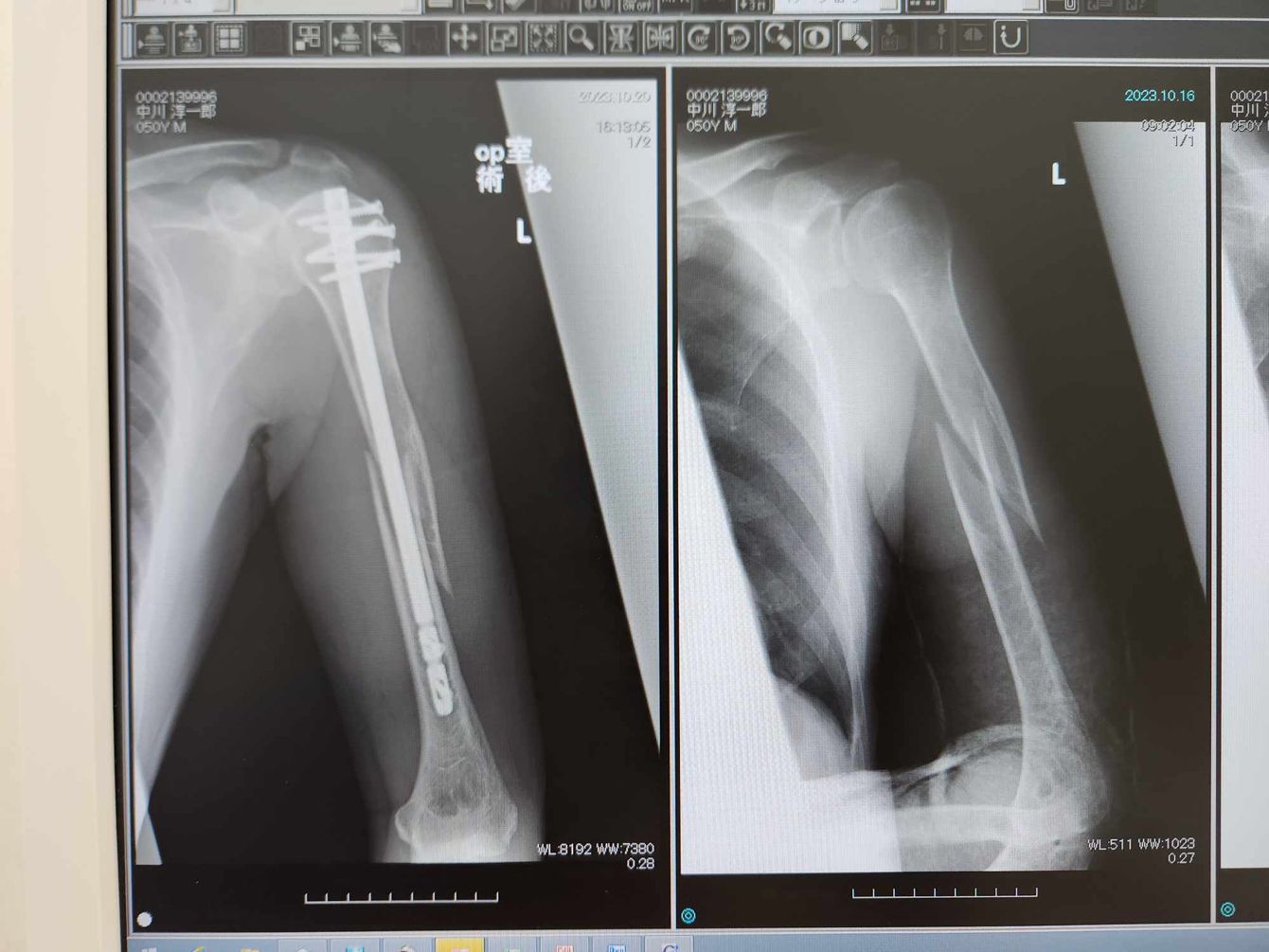 著者の左上腕部レントゲン写真。右が手術前、左が術後。