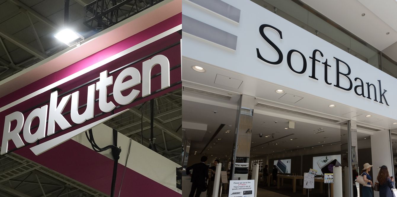 写真左=「Rakuten Optimism2023」に掲げられた楽天モバイルのロゴ(2023年8月2日、神奈川県横浜市のパシフィコ横浜) 写真右=東京の銀座にあるソフトバンクショップ本店